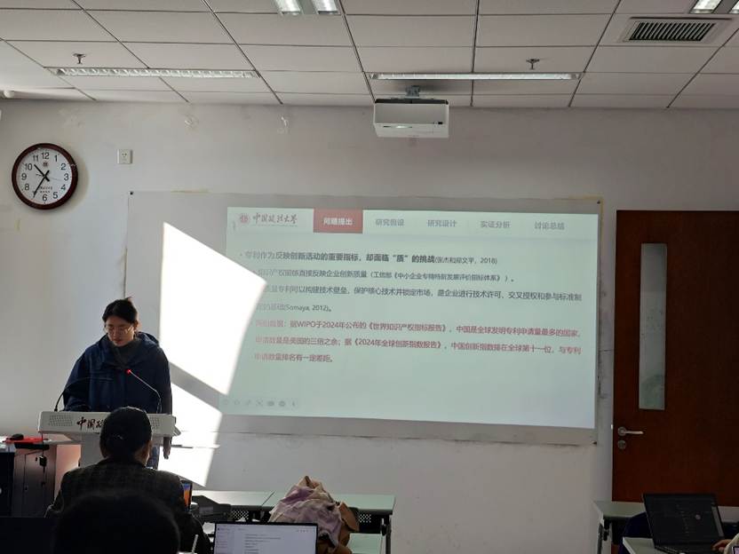 随后,2024级博士生宋晓晴同学带来了题为《创始人跨界研发经验对企业专利质量的影响》的分享。该研究聚焦于创始人的个人特质,深入分析了其跨界研发经验如何作为一种战略资源,显著提升企业的专利质量,揭示了企业创新能力形成的微观机制。